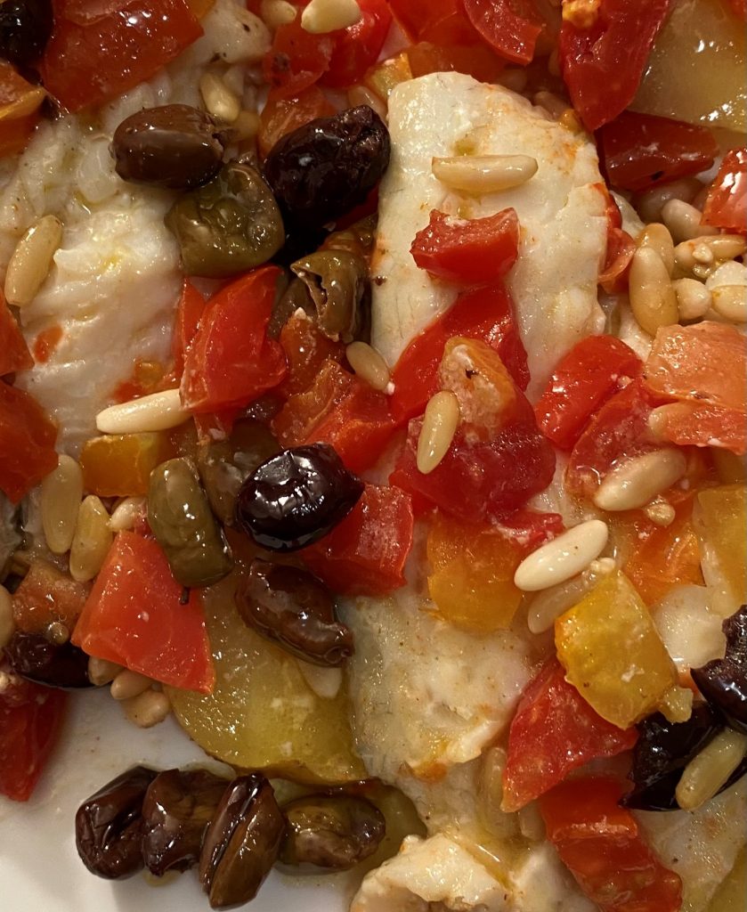 En la sartén puse un poco de aceite, añadí los tomatitos, los dejé cocinar un par de minutos y luego añadí los filetes, las aceitunas y los piñones, si es necesario añadir unas cucharadas de agua.