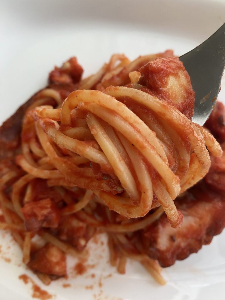En esta receta se perciben todos los sabores y se ven todos los colores de nuestro bello país, el mar con el pulpo, la tierra con el tomate y el oro de nuestro territorio, los espaguetis.
