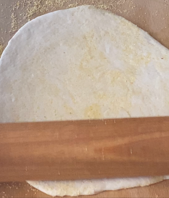 • Dejar leudar la bola, después de una hora dividir la masa en cuatro. Espolvorear la superficie con la harina de maíz.