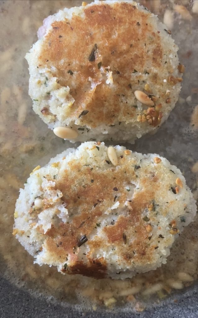 En una sartén calienta un poco de aceite, añade los piñones y luego el granillo de pistacho.