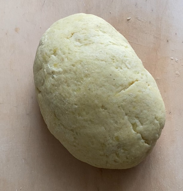 Terminar de amasar sobre una superficie enharinada y formar un bloque, como en la foto.