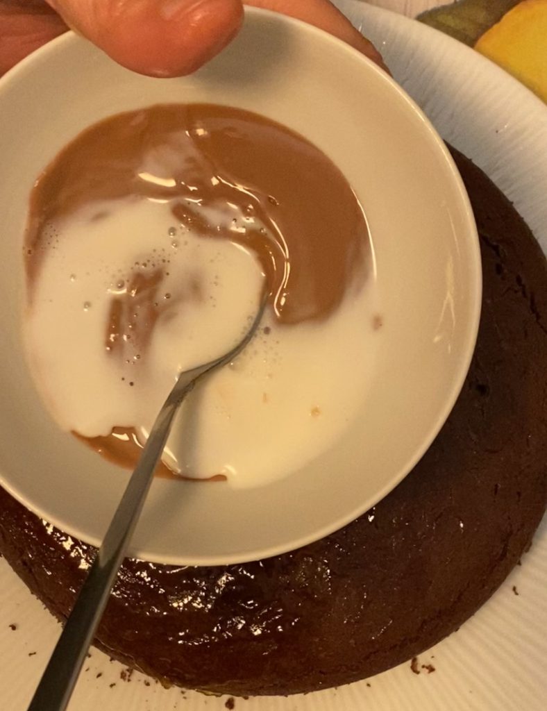 Una vez cocida y enfriada, la tarta se cubre con una capa de chocolate con leche fundido, que se solidifica en una corteza crujiente y deliciosa.