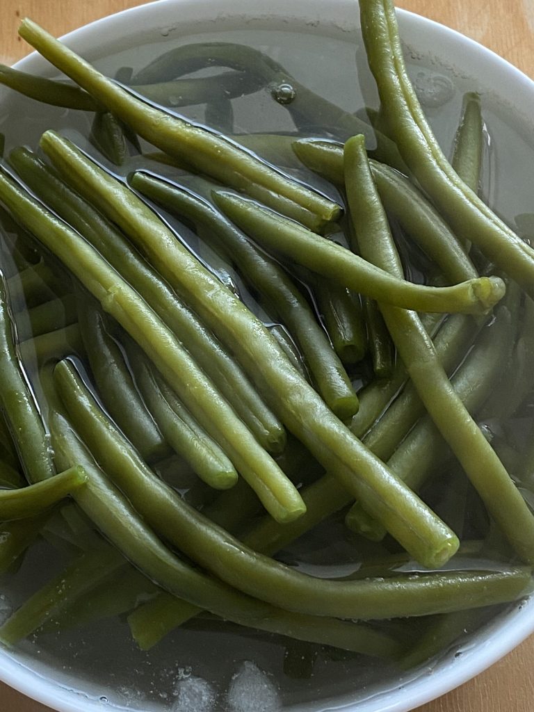 • Transferir las judías cocidas a un bol con hielo para mantener su color verde, este paso es opcional.