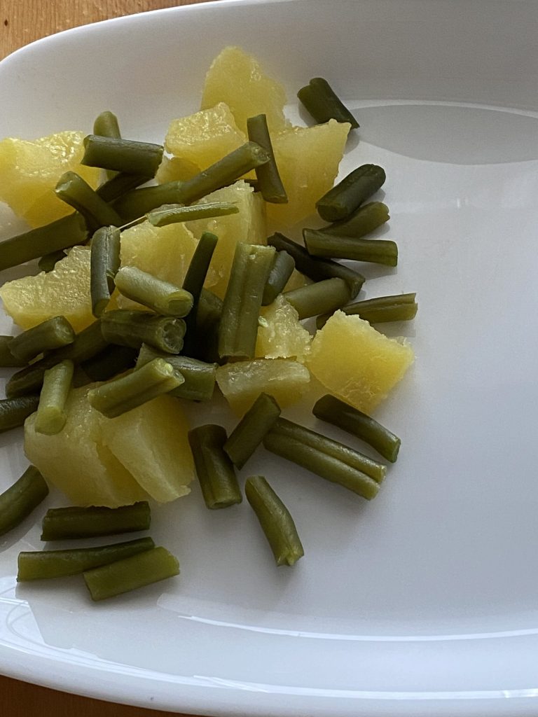 • Condimentar las patatas y las judías verdes con un chorrito de aceite