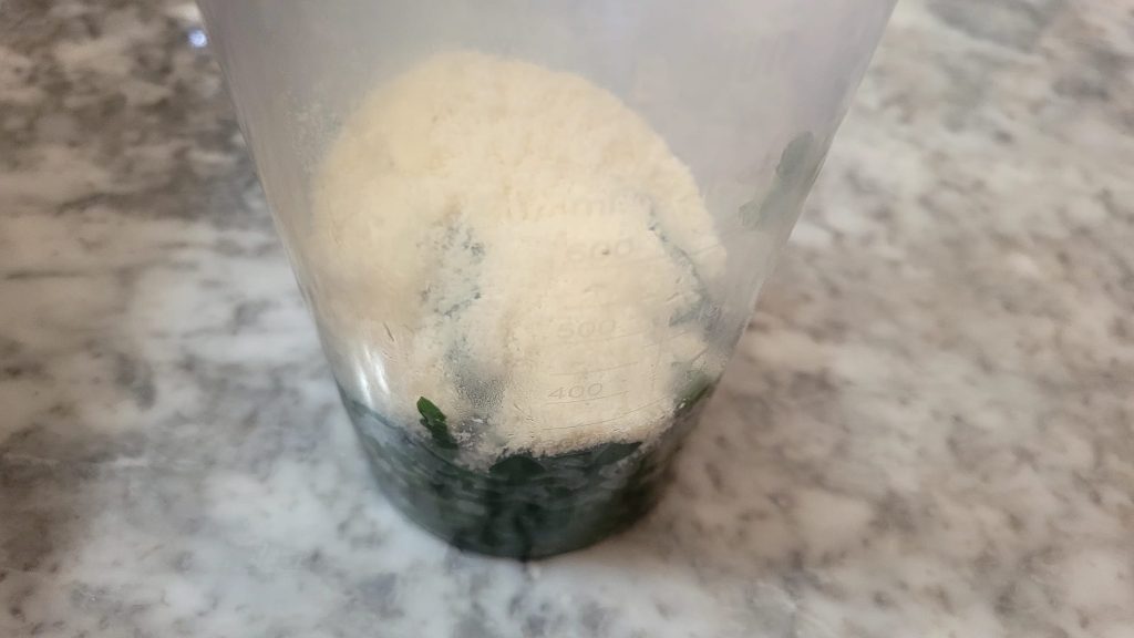 Déjalas templar y transfiérelas a un vaso y tritúralas con el minipimer añadiendo 35g de Grana Padano, una pizca de sal y resérvalas