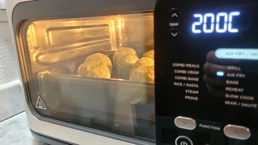 Transfiere las albóndigas a la rejilla de la freidora y dales algunas pulverizaciones de aceite