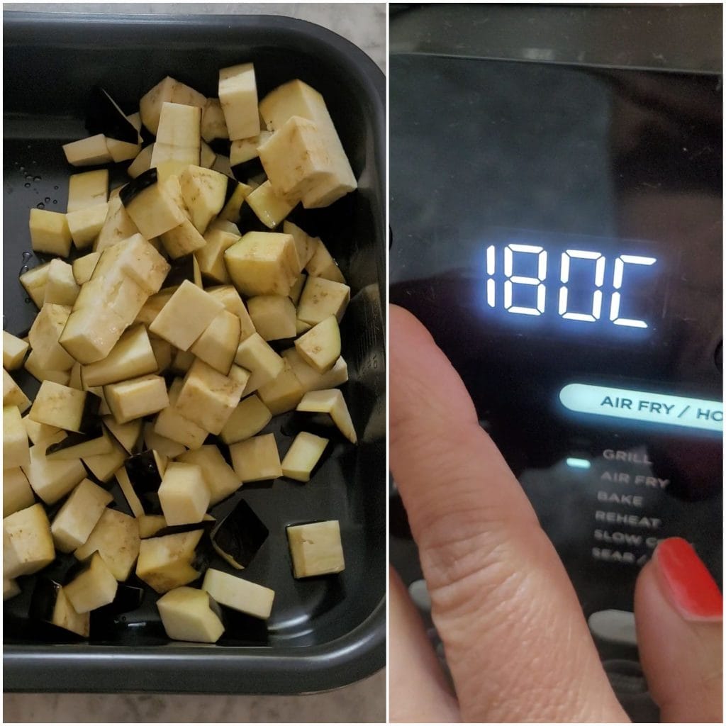Introduce la bandeja en la freidora y cocina a 180° por 18/20 minutos. Remueve de vez en cuando durante la cocción. Si las berenjenas te parecen secas, rocía un poco de aceite