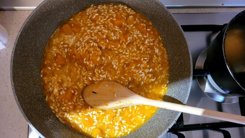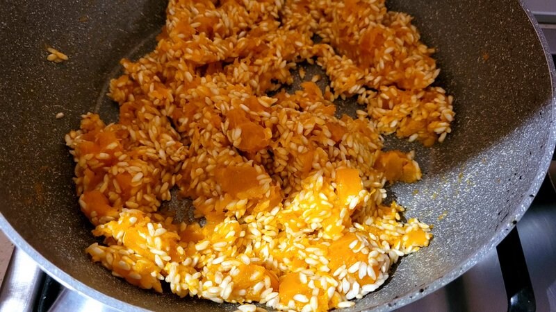 • En otra sartén tostáis el arroz y lo añadís a la calabaza, mojáis con el caldo vegetal hasta que esté cocido.