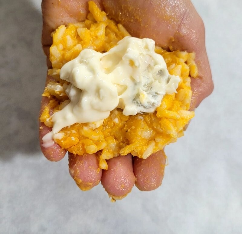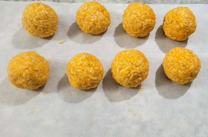 • Terminado el tiempo de reposo, coged un poco de arroz y ponedlo en la palma de la mano, colocad el gorgonzola y cerrad con más arroz dándole la clásica forma redonda de las arancinas.