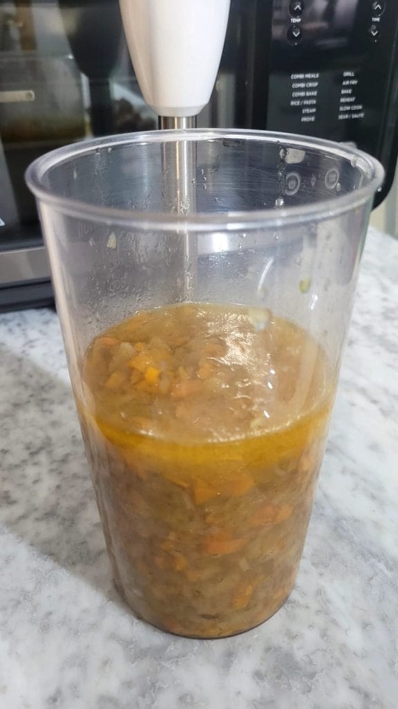 Las manzanas y el sofrito se trituran con la batidora de inmersión y se vierten sobre las rodajas de asado.