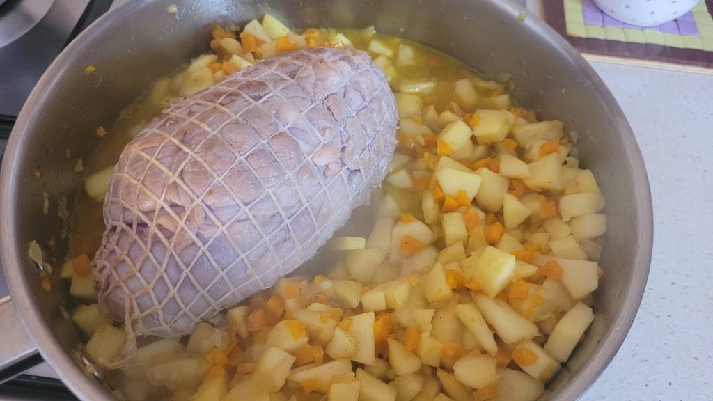 El asado con salsa de manzana es sencillo de preparar: la cocción larga y lenta en la cacerola hace que la carne quede tierna y jugosa. El caldo vegetal utilizado durante la cocción es un caldo listo, pero si lo prefieres puedes prepararlo tú mismo, ya sea de carne o vegetal, es indiferente en tanto a las manzanas he utilizado la variedad golden.