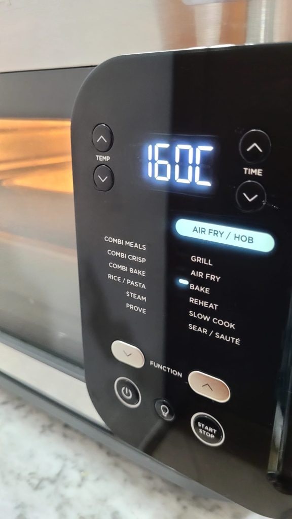 Precalienta la freidora durante 2/3 minutos, inserta el molde en la rejilla e inicia la cocción en el programa bake 160° x 35 minutos. Haz siempre la prueba del palillo en varios puntos y especialmente en el centro, si sale seco el bizcocho está listo, de lo contrario continúa durante 5 minutos.