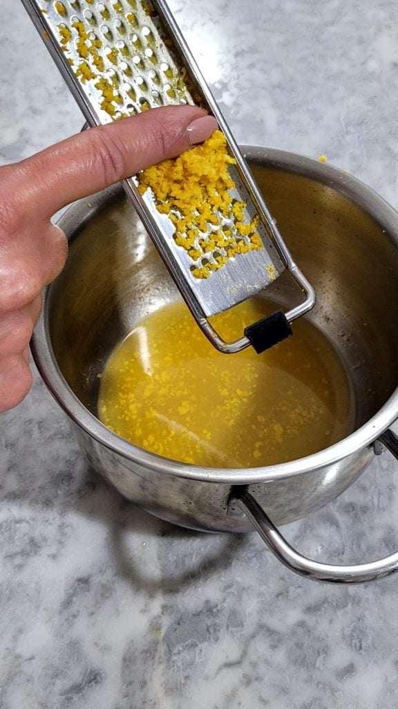 Vierte en una cacerola el jugo de naranja filtrado y la cáscara rallada, mezcla con un batidor de mano