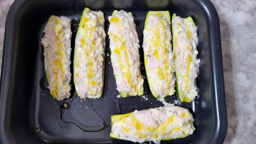 Rellena los calabacines con la mezcla de relleno. Asegúrate de compactar bien el relleno para que no se disperse durante la cocción. Transfiere los calabacines rellenos a una bandeja ligeramente engrasada con aceite de oliva. Espolvorea con parmesano rallado y rocía con aceite de oliva los calabacines