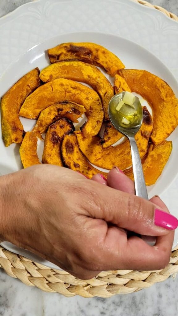 La Calabaza agridulce es un acompañamiento presente en mi mesa desde que era pequeña, preparada por mi madre, palermitana, y que se prepara con la calabaza frita al método tradicional en sartén con aceite hirviendo. La característica de la receta original, que hace la calabaza particularmente sabrosa, es el aceite de la fritura, que se reutiliza para condimentar la calabaza tras haber dorado muchos trocitos de ajo y mezclado con vinagre y azúcar. Obviamente en Freidora de aire, no fue posible replicar este paso dada la escasa cantidad de aceite empleada en la cocción, así que el sofrito de ajo lo preparé aparte y luego lo mezclé.