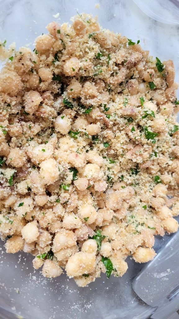 Añade el pan rallado, el grana rallado, el perejil picado, sal y pimienta, mezcla y amalgama la mezcla