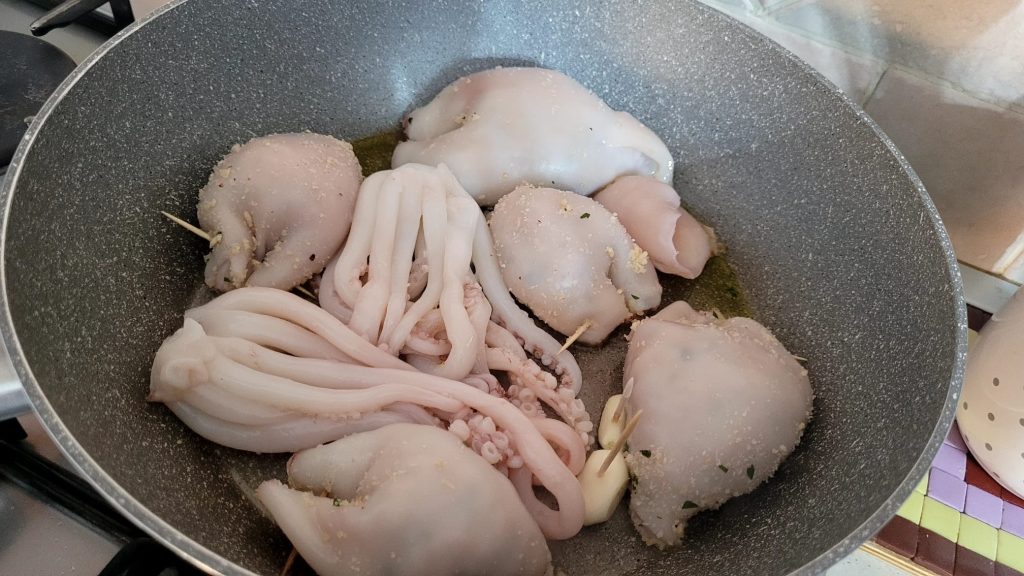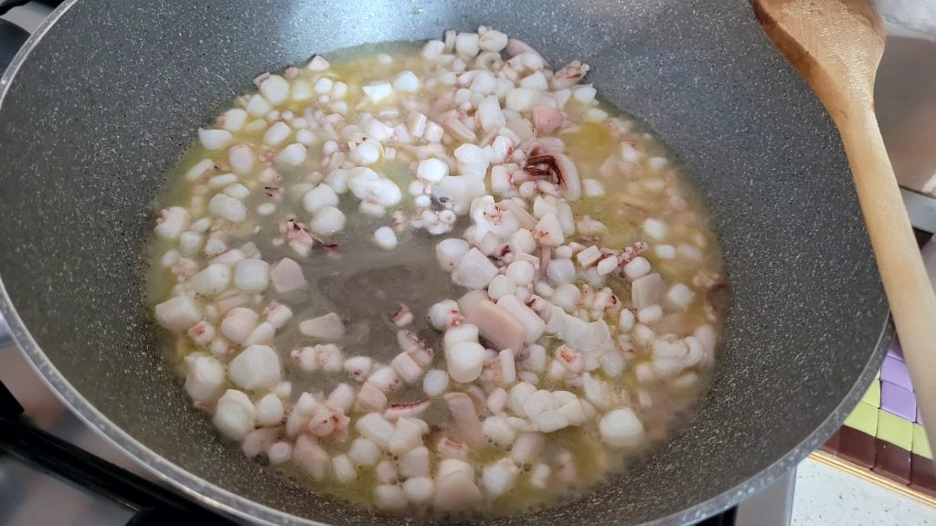 Añade los tentáculos y las aletas, dóralos a fuego alto, luego rocía con 70 ml de vino blanco y, una vez evaporada la parte alcohólica, cocínalos por unos minutos
