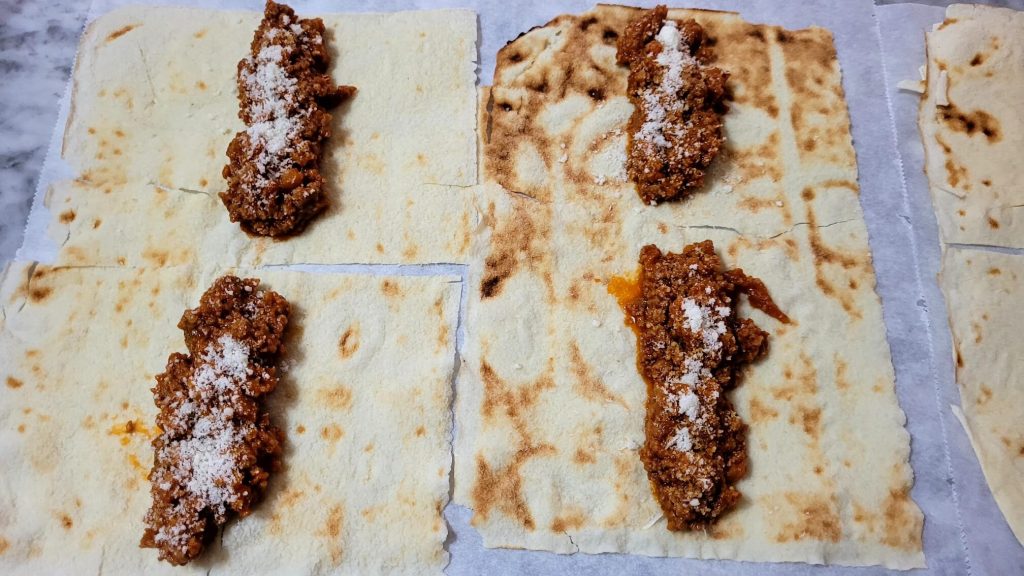 Añade en el centro el ragú, yo también he añadido un poco de queso parmesano rallado