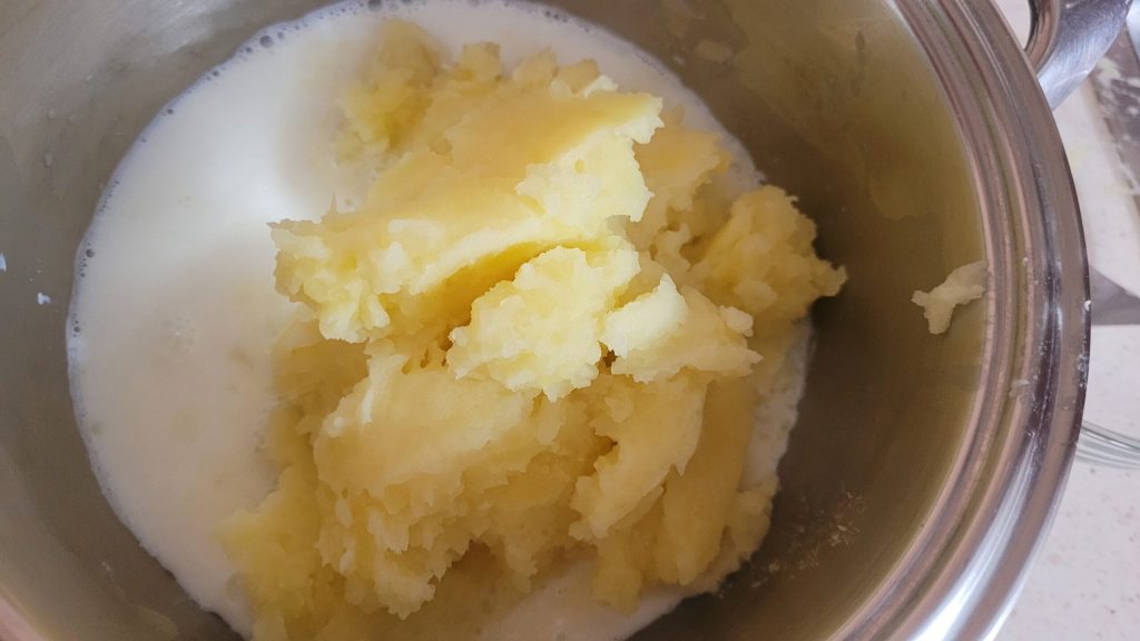 Primero, prepara el puré hirviendo las patatas, después de pelarlas y cortarlas en trozos. Yo las cociné al vapor en mi freidora de aire que también es un multicoocker. Una vez listas, trasládalas a un bol, aplastándolas en caliente con un tenedor. Vierte en una olla la leche, añade las patatas aplastadas, sal, pimienta y una generosa ralladura de nuez moscada y cocina el puré hasta que las patatas hayan absorbido toda la leche.