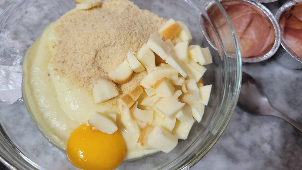 A este punto, añade la yema, las 3 cucharadas de pan rallado y la provola ahumada cortada en dados, mezclando todo.