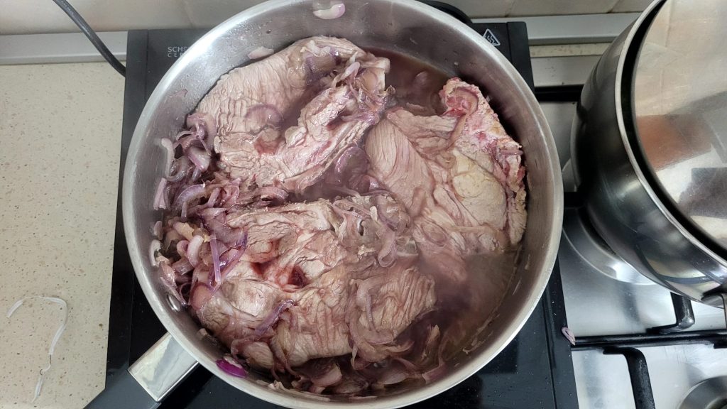 No es necesario utilizar un vino caro, basta con una copa de un vino con cuerpo, para esta receta he utilizado un negroamaro. Para la cebolla he elegido la roja que añade un poco de dulzura al plato, que unido al vino aporta un aroma muy invitante y sabroso.
