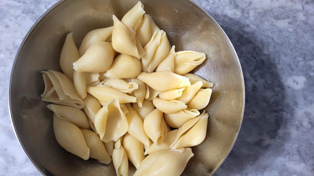• Cocina en una olla con abundante agua salada, escurre los conchiglioni un par de minutos antes del tiempo indicado en el paquete. Recuerda guardar el agua de cocción que servirá para la crema de pecorino. Escúrrelos y transfiérelos a un cuenco limpio con un chorrito de aceite de oliva virgen extra para evitar que se peguen entre sí