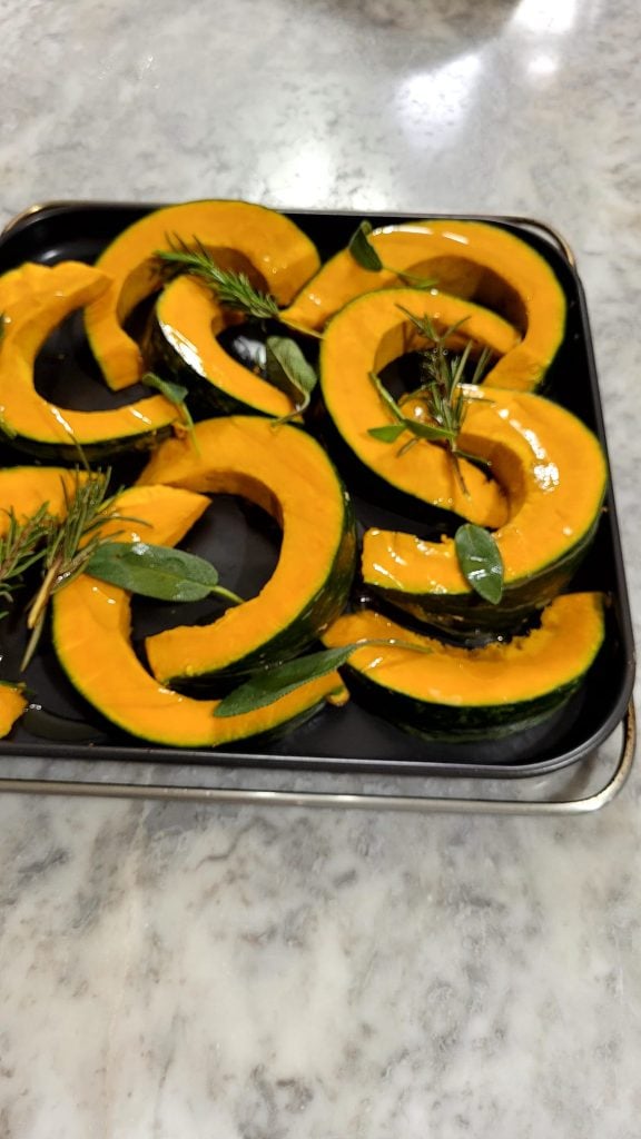 • Corta la calabaza en rodajas y colócalas en la parrilla o bandeja de tu freidora. Agrega unas ramitas de romero y unas hojas de salvia y rocía con un chorrito de aceite de oliva virgen extra
