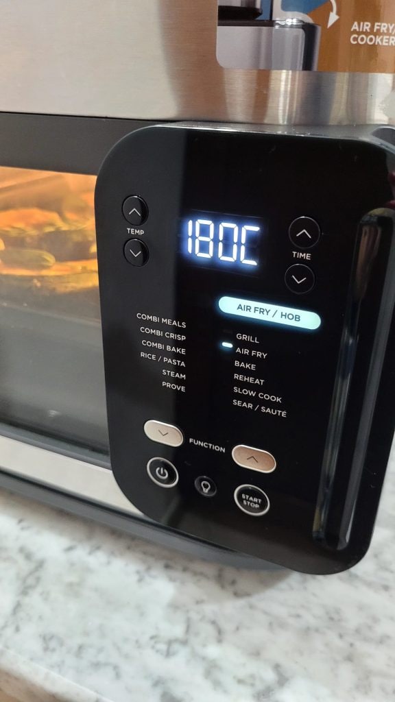 • Introduce la parrilla o la bandeja en la freidora y activa la cocción con el programa de aire caliente a 180° durante 17 minutos