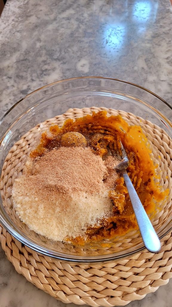 • Después de hacer la calabaza puré, añade los ingredientes: el parmesano, el huevo, la sal, la pimienta y la nuez moscada