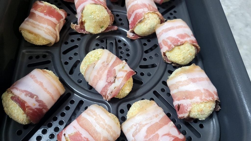 • A medida que las envuelves en la panceta, transfiérelas a la parrilla de tu freidora