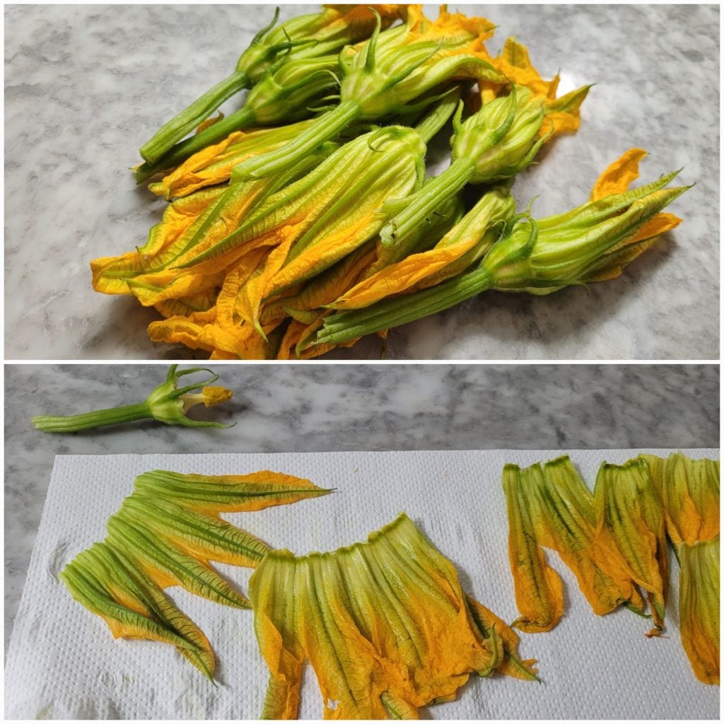 Ahora pasamos a las flores de calabacín. Elimina el tallo y el pistilo de la flor abriéndolas muy delicadamente. Límpialas con un paño de papel mojado con agua, tanto por dentro como por fuera