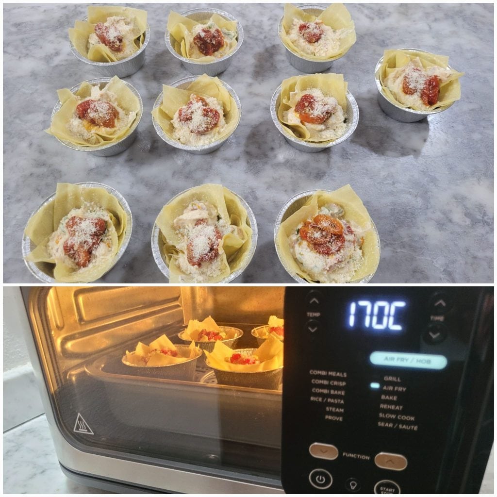 Cómo se preparan los Cupcakes de Lasaña con Flores de Calabacín, Tomatitos y Ricotta en Freidora de Aire