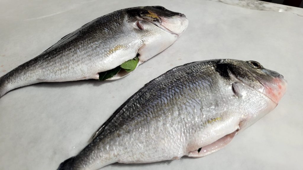 Sécalo bien con papel absorbente e inserta en la barriga 1 hoja de laurel y 2 hojas de salvia por cada dorada