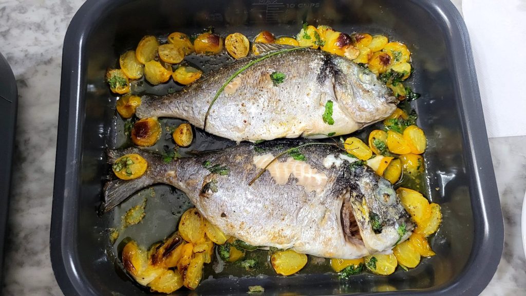 Para la Dorada en Freidora de Aire, he utilizado solo aromas que he introducido en el vientre del pescado, tomate cherry amarillo, lo adoro por su dulzura y es a menudo protagonista de mis recetas como en los Paccheri con Pez Espada y Berenjenas y en los Filetes de Platija al Cartucho, pero si no lo tienes en casa lo puedes sustituir por el rojo o por el piccadilly que es igualmente bueno.