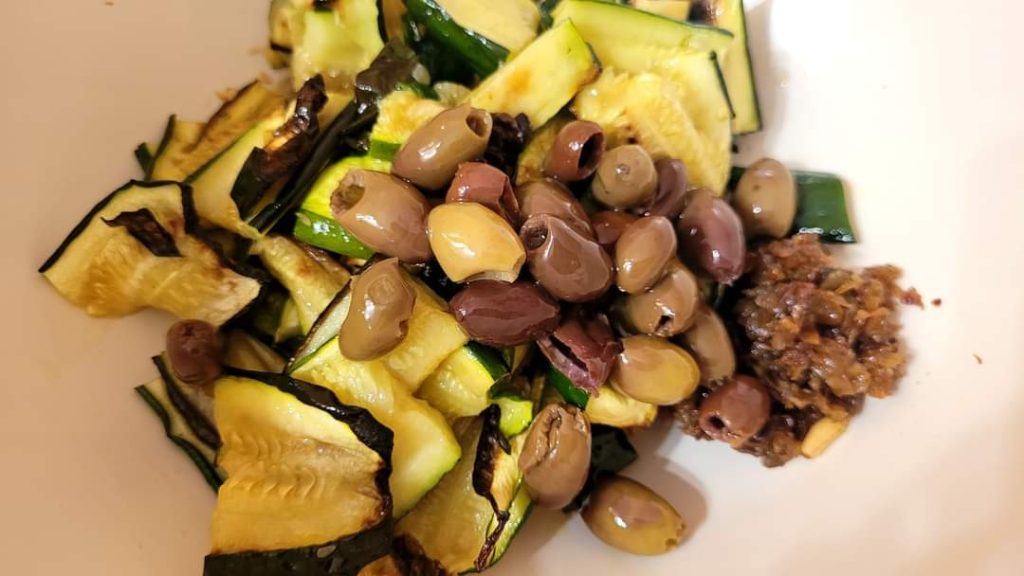 • En una tabla de cortar he picado groseramente los piñones tostados. He picado las alcaparras, que previamente había desalado, y las pasas, que había rehidratado en un vaso con agua tibia, que también he picado con cuchillo. He cortado en trozos los calabacines y he puesto todo junto en un bol añadiendo un buen chorro de aceite de oliva virgen extra