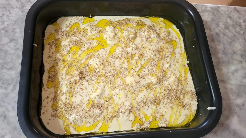 Cubre con el resto de la mezcla y nivélala con el dorso de una cuchara. Esparce las semillas de sésamo en la superficie (opcional) y rocía con aceite de oliva