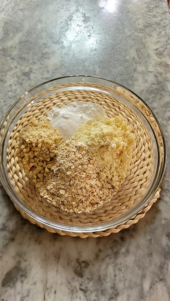 Vierte en un tazón la harina, el azúcar, la levadura, los copos de avena, las almendras y el chocolate blanco picado, a cuchillo, de manera gruesa