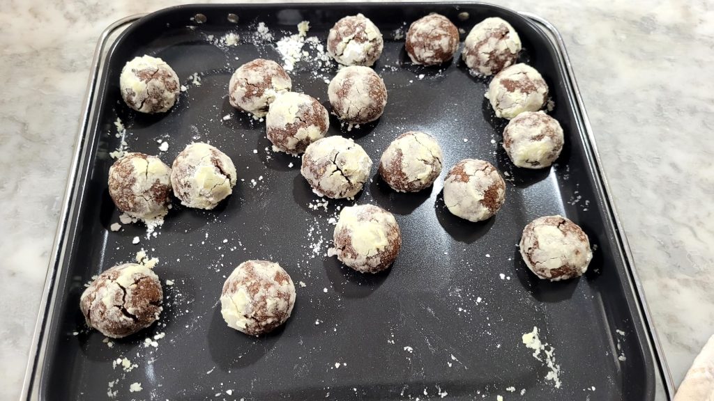 • Una vez transcurrido el tiempo de reposo en el frigorífico, separa pequeños trozos de masa y forma bolitas un poco más grandes que una nuez. Vierte el azúcar glas en un cuenco y cúbrelas haciéndolas rodar dentro