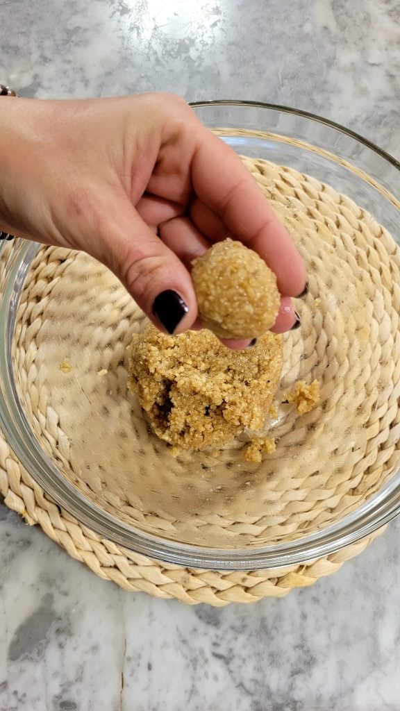 Humedece tus manos, toma pequeños trozos de masa y forma bolitas del tamaño de una nuez