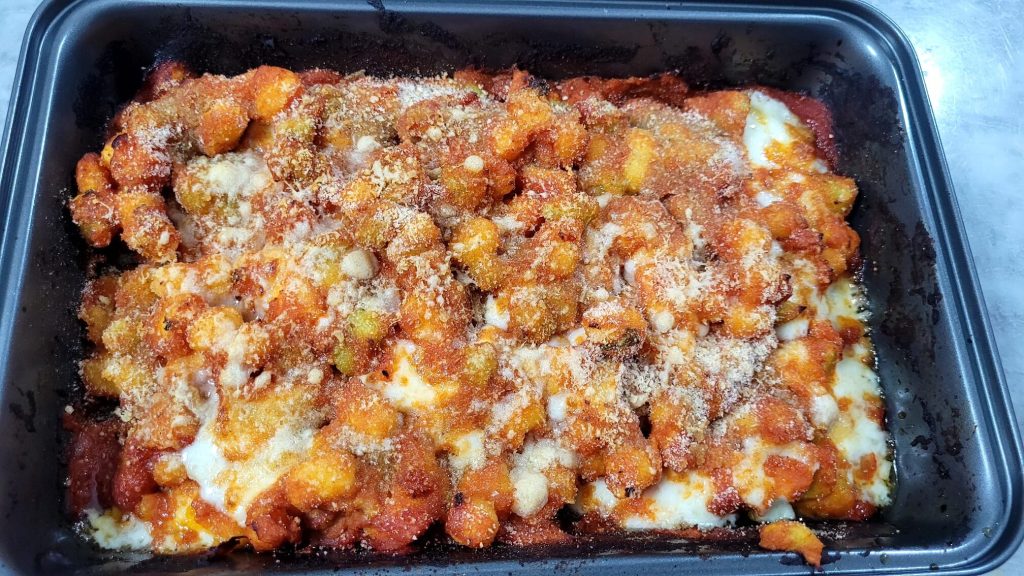Retirad la bandeja, añadid la Toma cortada en dados, amalgamado bien y espolvoread la superficie de los gnocchi con una cucharada de grana y pan rallado. Rociad con aceite de oliva virgen extra. Volved a introducir la bandeja en la freidora y cocinad a 190° x 5 minutos o hasta que el queso esté completamente derretido y la superficie dorada