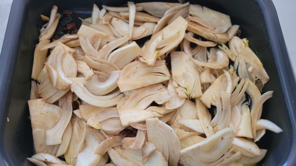• Limpia y corta los hinojos en rodajas finas (reserva un poco de las hojas para decorar), colócalos en una bandeja y condiméntalos con la emulsión de aceite, vinagre blanco, glasa, sal, pimienta, el chile picado y las pasas previamente rehidratadas y escurridas. Mezcla bien y añade una taza de agua, no más, los hinojos ya contienen agua por sí solos.