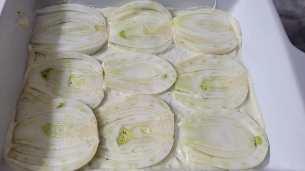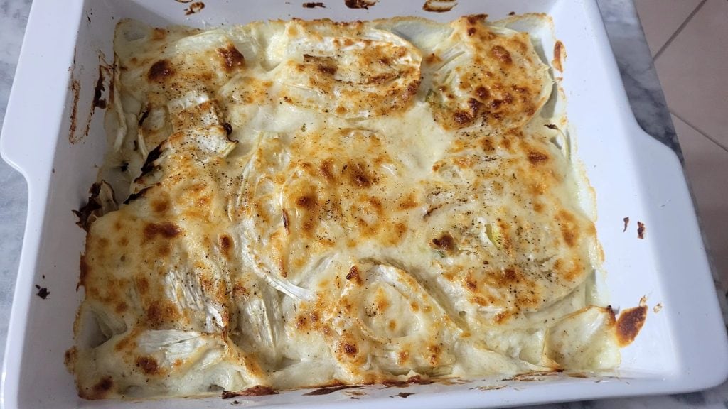 Esta receta también es rápida de preparar porque no requiere la precocción de los hinojos, basta con cortarlos en rodajas, no demasiado gruesas, y condimentarlos en capas con una bechamel cremosa y aterciopelada, tal como se hace con las lasañas.