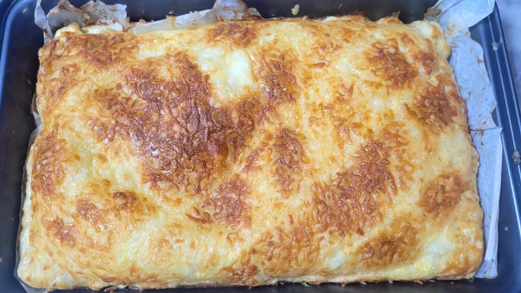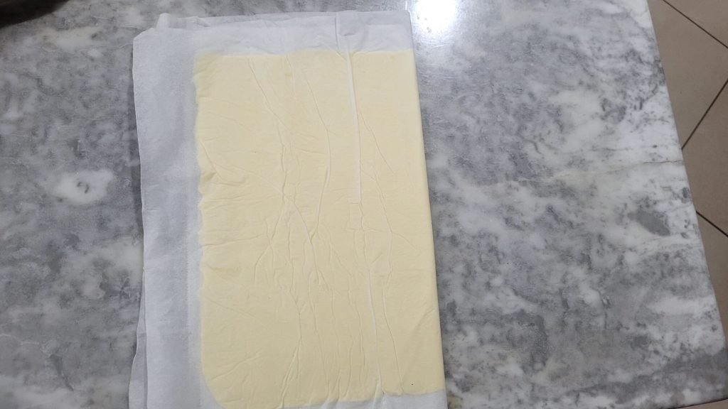 Para preparar esta receta utilicé un hojaldre rectangular, que dividí a la mitad y rellené con un relleno de quesos triturados junto con patatas y huevo.