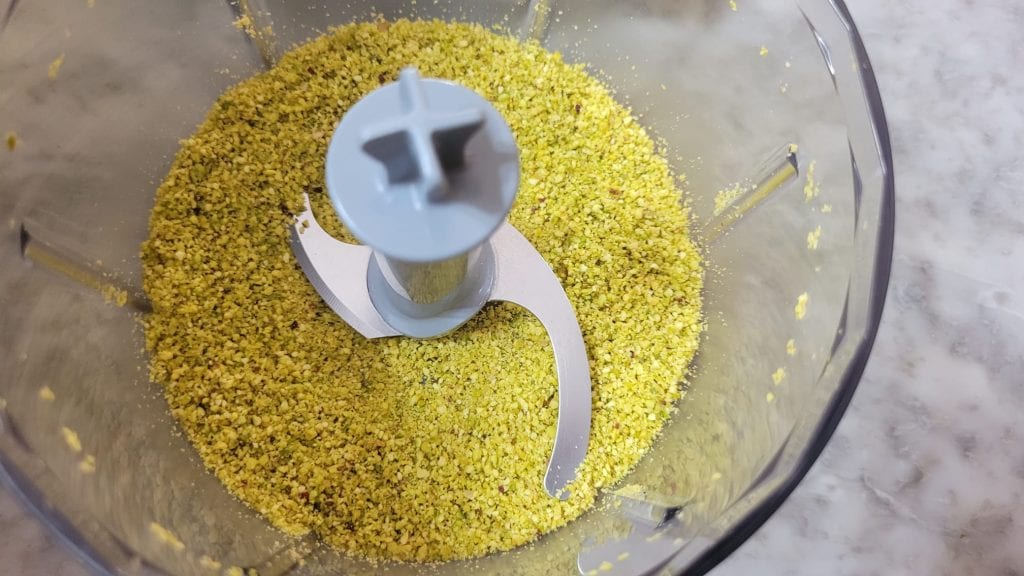 • Empieza moliendo los 40 g de pistachos en el picador y corta los restantes groseramente con un cuchillo