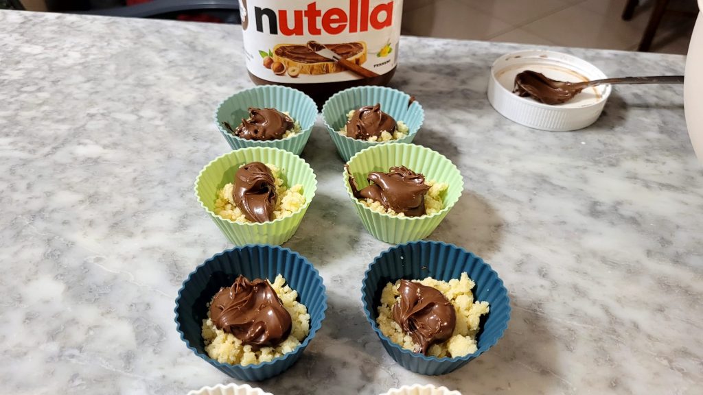 • Vierte en el fondo de los moldes una parte de la masa desmenuzada y añade 1 cucharadita de Nutella por cada molde.