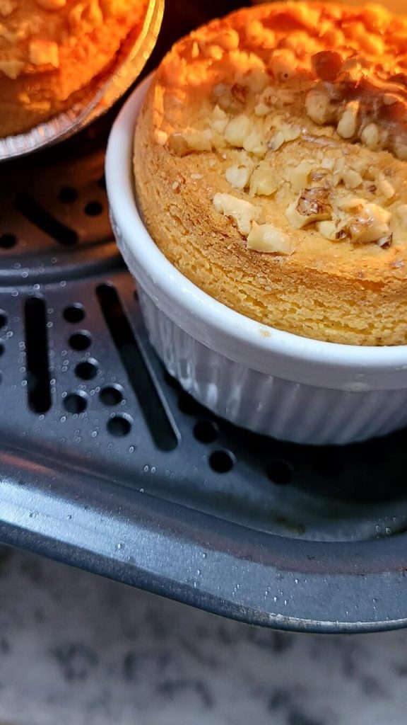 • Añade en la superficie de cada muffin, un trozo entero de nuez y otro desmenuzado. Coloca los moldes en la rejilla o en la bandeja de tu freidora de aire