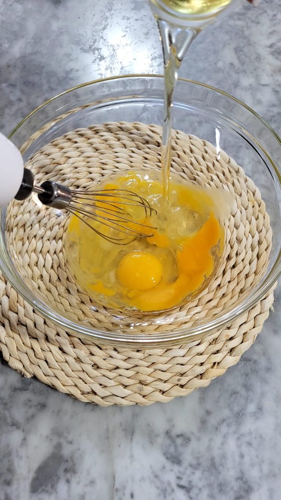 • En un bol, bate con la batidora eléctrica, los huevos con una pizca de sal y el aceite