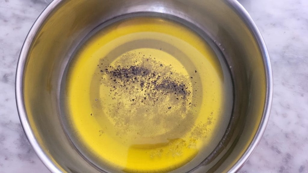 Prepara la emulsión de aceite de oliva virgen extra en un bol con una pizca de sal y pimienta si lo deseas
