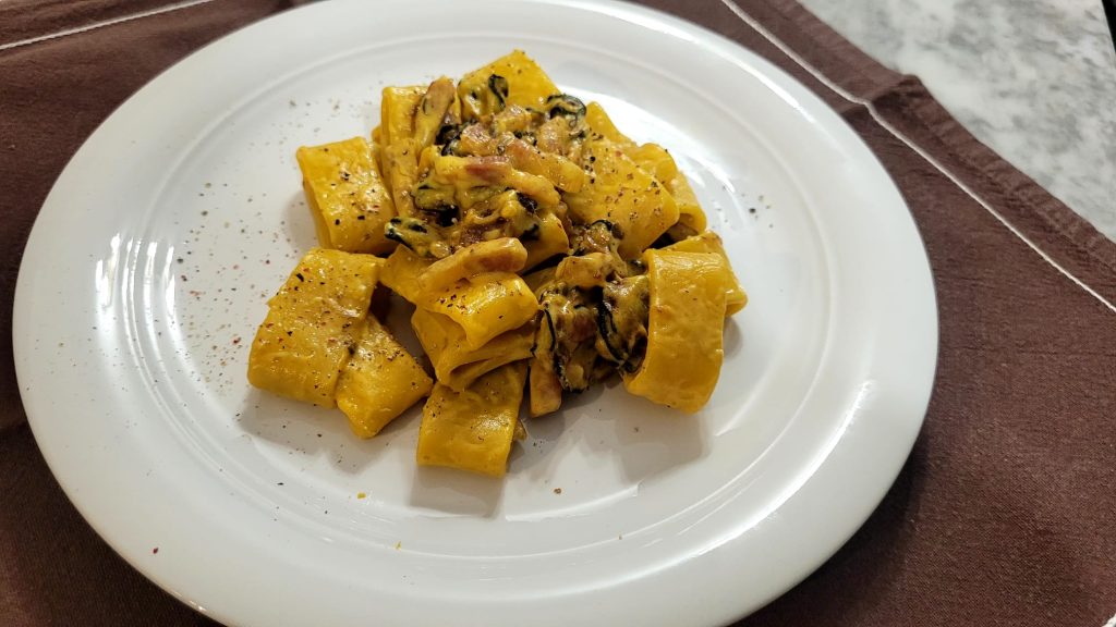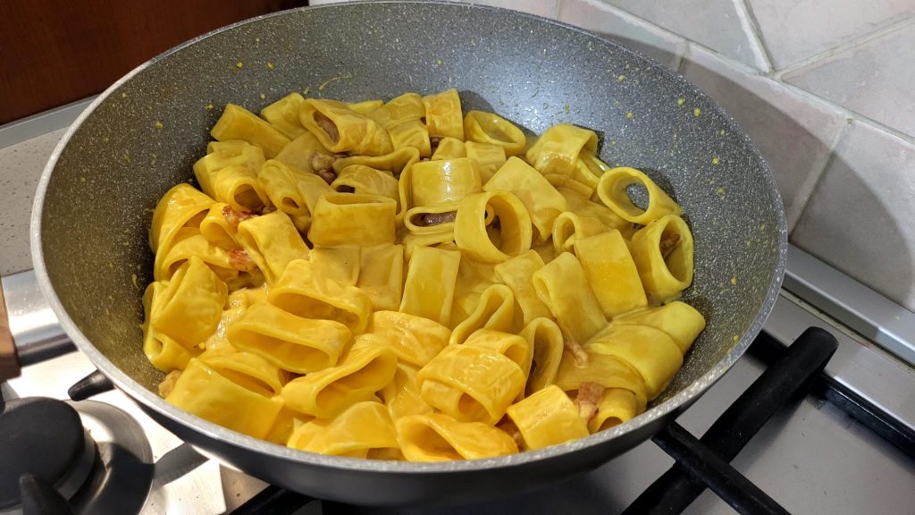 La pasta con crema de azafrán, calabacines y panceta, es un primer plato apetitoso y rápido de preparar. La delicada crema de stracchino, combinada con el azafrán, contrasta con el sabor fuerte de la panceta y el dulce de los calabacines, un verdadero placer para el paladar.