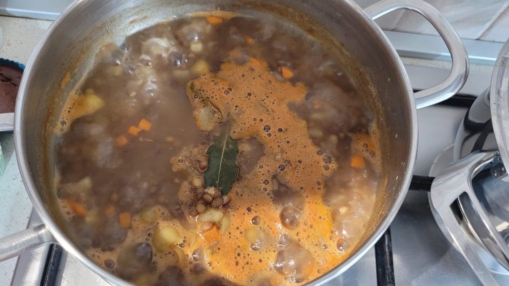 La Pasta y Lentejas es un plato simple y rápido de preparar, sin sofritos, todo crudo en la olla con la adición de aromáticas y ajo que añaden más sabor a este plato. Yo lo hago tal como mi abuela y como aún lo hace mi madre, solo he agregado una zanahoria y una patata para hacer la Pasta y Lentejas más cremosa y una vez lista, un chorrito de aceite en crudo, una pizca de pimienta y verás qué delicia.